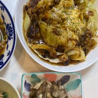 キャベツはざく切りにして炒めたり、水を入れずにカレー粉を挽き肉に絡めてます。蒸すと蓋の洗い物が増えるので、お皿に盛り付ける時に、キャベツ→とろけるチーズ→挽き肉→粉チーズとパセリの順番で挟んでます。