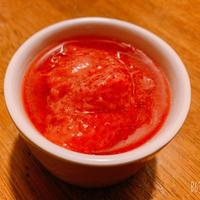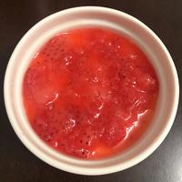 - 5 大きめの耐熱ボウルにいちごソースの材料を入れ、スプーンの背でいちごを軽く潰しながら混ぜ合わせ、ラップをかけます。600Wの電子レンジで2分加熱し、粗熱を取ります。