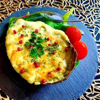 アボカドの皮を器にして、くり抜いた実の上にホワイトソースをかけて、ピザ用チーズを乗せて焼いてアボカドグラタンに◎美味しかった♡
