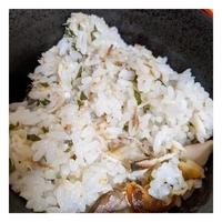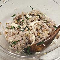 - 4 ボウルにごはんと1、2/3の量の2、3、白いりごまを入れ、しゃもじで切るように混ぜます。