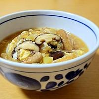 - 3 しいたけがしんなりしたら、水溶き片栗粉を入れて中火で加熱し、とろみをつけ、溶き卵を入れて混ぜ、卵が固まったら火から下ろします。