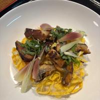 ウナギは中国産真空パック賞味期限間近で半額、湯煎のあと熱湯でタレ流して軽く焼き、ふっくらカリッと仕上げ ミョウガ、大葉トッピング、最後にレモンピールで爽やかな香り