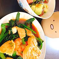 - 6 エビに火が通ったら強火にして、2を入れてさっと炒めたら(A)を入れ一気に混ぜ合わせます。