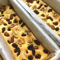 - 5 4の生地を1の型に流し入れ、ミックスナッツを敷き詰めます。