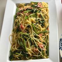 空芯菜いつも中華風炒めしかしたことがなかったけどガーリックバターすごくいい👍舞茸とベーコンで