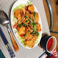 ジューシーにしたかったので鶏もも肉で、練乳がなかったので砂糖で、ネギが苦手なのでネギなしで、ご飯の上に乗せずにおかずとして作りました。
