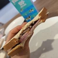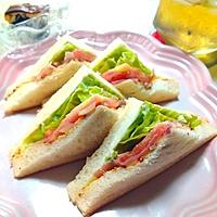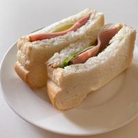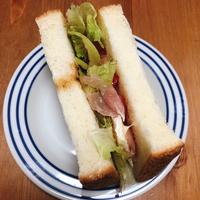 6枚切りのパンに生ハム、トマト、レタス、カマンベールチーズを挟みました。ソースが甘じょっぱくて美味しかったです!