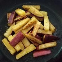 油で揚げず、少なめの油で炒め、芋の水分で蒸し焼きにしました。その分、砂糖多めにしカリッとさせました。フライパンで手軽に出来きて美味しかったです😄