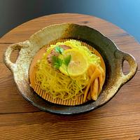 - 4 2と3をそれぞれ器に盛り付け、3の上に1と魚粉をのせ、2に残りのトッピングをのせて完成です。