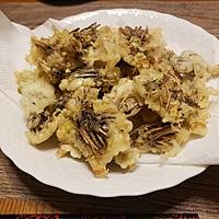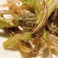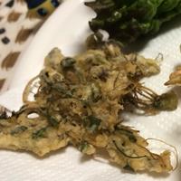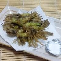 季節の味が美味しい香りが豊かなせり根の天ぷらです。せり根を捨ててしまう方が多いと思いますが、根っこ部分は香りが強くとても美味しく食べられる部分です。使用する際にはよく洗ってから調理して下さい。湯がいて油揚げとおひたしにしても美味しいです。