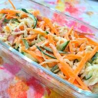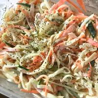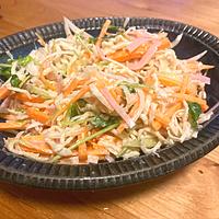 シャキシャキとした歯ごたえが特徴的な切り干し大根のサラダです。マヨネーズベースの味付けですが、レモン汁を加えることでさっぱりと爽やかな仕上がりに。きゅうり、人参、ハム(カニカマに変更も可)などの具材とよく合い、食べ応えも満足感も抜群です。作り置きができ、よく冷やして食べるとより美味しく楽しめます。野菜がたっぷり摂れるヘルシーなメニューで、子供からも好評とのこと。