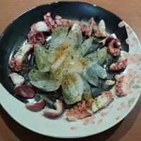 - 4 皿の中央に玉ねぎを置き、周りにタコを並べて、上から塩、パプリカパウダーを振ってオリーブオイルをかけたらできあがりです。お好みでイタリアンパセリを飾ってください。