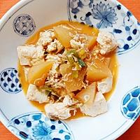 大根と豆腐を使って甘辛味噌煮込みのレシピです。ちりめんじゃこの出汁が出て旨みが広がります。ごはんとよく合うので一緒にお召し上がりください。熱々の大根と豆腐で身体も温まるので寒い時期にもぴったりですよ。