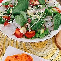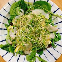 - 5 お皿にベビーリーフ、1、2、3、ブロッコリースプラウト、バジルを盛って、4をかけ、ハーブソルトを振りかけて、出来上がりです。