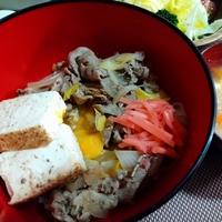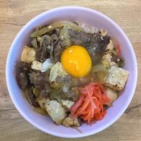 すき焼き風の牛丼のご紹介です。甘からい濃いめの味が具材に染み込み、ごはんに良く合います。卵黄を絡めると、コクとまろやかさが加わり美味しいですよ。いつもの牛丼の味に変化を付けたい時などにおすすめです。是非、おためしください。