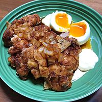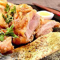 - 9 5の鶏もも肉からパチパチと音がして衣がきつね色になったら裏返し、弱火にし、揚げ油の温度を180℃にして4分程揚げます。