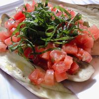 - 2 大葉、ミョウガを千切り、トマトを角切りにします。
