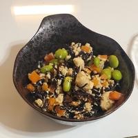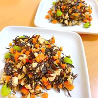 - 3 フライパンにごま油をひき、中火で豆腐とにんじんを炒めます。豆腐が崩れたら枝豆、ひじき、(A)を入れ、弱火で5〜6分煮込んで出来上がりです。