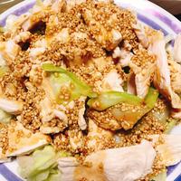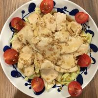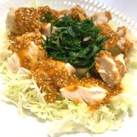 - 4 お皿にとり胸肉を盛り、(A)のごまポン酢を回しかけたら完成です。