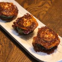 - 4 フライパンを中火で熱し、ピザ用チーズの半量を6等分して入れたら、1の半量と2を乗せます。