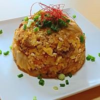 - 5 豚肉に火が通ったら、そこにキムチを入れて軽く炒め、白米を加えて更に炒め合わせます。