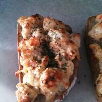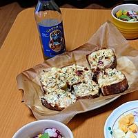 - 2 1とコンソメ、ニンニク、マヨネーズ、チーズを混ぜバケットに塗りトースターで焼きます。(焦げそうな時はアルミホイルを被せてください)