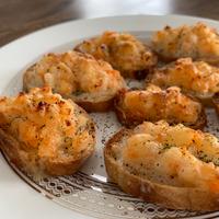 マヨネーズで和えたプリプリの海老とカリッと焼けたバケットは相性抜群です‼︎ バケットの代わりに食パンに贅沢にのせて食べるのもオススメです!フライパンを一切使わず、簡単そして時短で出来るので是非お試しください。