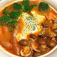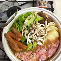 オリーブオイルでにんにくと鷹の爪を炒めてからカットトマト缶とシャンタンでスープを作り、豚バラ、キャベツ、玉ねぎ、しいたけ、しめじ、ソーセージを入れました。
