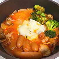 - 5 ひと煮立ちしたら、3、ブロッコリー以外の1、ウインナーを入れ蓋をし、中火で8分程加熱します。