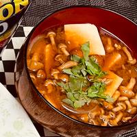 和風一番だしを使ったなめこの赤だしです。豆腐となめこに三つ葉をあしらい、八丁みそと普通の米みそをブレンドして味付けしました。時間のあるときに一番だしを取っておけば、すぐに本格的な風味が楽しめますよ。ぜひお試しくださいね。