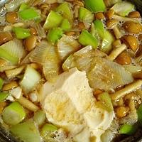 - 5 1となめこを加え、弱火で温めて、沸騰直前に火を止めます。