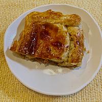 - 3 のばして半分に切った冷凍パイシートの片方に2を乗せてもう片方を被せたら、端をくるくると巻きます。