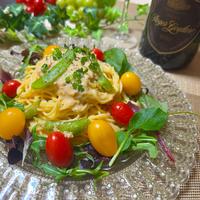パスタソースには、シャキシャキ食感、旬のスナップエンドウを加えてみました◎