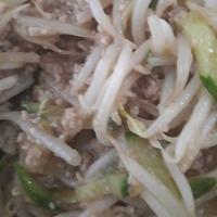 - 2 もやしは半分程度のサイズにざく切り、きゅうりは縦半分にしてから薄切りにします。