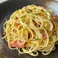 にんにくの香ばしい香りが食欲をそそる定番パスタ。シンプルな材料ながら、オリーブオイルをたっぷり使うことで艶やかな仕上がりに。茹で汁を加えることで、最後までパサつかない食感を保てます。ベーコンやエビ、マッシュルームなど具材をアレンジして楽しめ、コンソメを隠し味に加えると旨みが増します。アンチョビを加えたり、鷹の爪の量を調整して、お好みの味に仕上げられます。