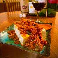 暑い日は冷たいお豆腐がとてもおいしいですね。 冷たい木綿豆腐に温かいイタリアンなソースをかけていただく新感覚のメニューです。 すりおろしニンニクと鷹の爪輪切りのピリ辛のおいしさでご飯もお酒も進みますよ。