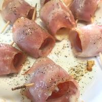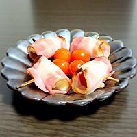- 2 薄切りハーフベーコンの上にミニトマトを置き、ベーコンで巻き、つなぎ目を楊枝でとめます。