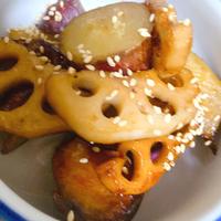 さつまいも切る→水につけ→量多いので2回に分けて(あとで煮るので少し固めでok)レンチン4分→サラダ油→蓮根だけ先(さつまいも同時に入れると崩れるので)焼く→さつまいも→調味料→アルミホイルで落とし蓋してタイマー入れて5分