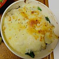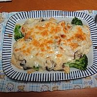 - 8 半量のホワイトソースをかけ、4の牡蠣とブロッコリーをのせ、残りのホワイトソースをかけます。