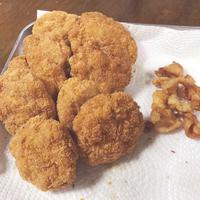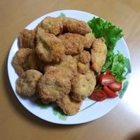 - 5 フライパンの底から3cm程の揚げ油を注ぎ、180℃に熱し、4を入れます。中に火が通るまで8分程揚げ、こんがりと色付いたら油を切ります。