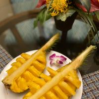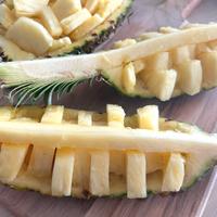 パイナップル切り方をアレンジした、南国風なパイナップルの飾り切りのご紹介です。芯を残した切り方をすることで、カットパイナップルのお皿のような役割をしてくれます。見た目よりも簡単に切れて、見映えもするのでぜひお試しください。