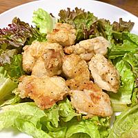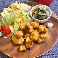 (レモン汁大さじ1、にんにくのすりおろし、塩、鶏ガラスープの素、酒を各少々に15分以上つけておく。そして片栗粉大さじ5、塩、粗挽き黒胡椒、砂糖を各少々をまぶしました)