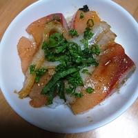 海苔を散らしたご飯の上に鯛の切り身と薬味を盛って、市販のゴマだれポン酢をかけて食べました😄ちょいわさびとごま油も良いアクセントに◎美味しかったです!!!