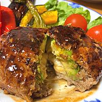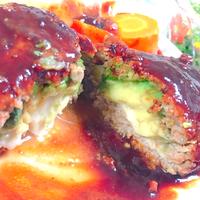 ジューシーなハンバーグの中から、アボカドとチーズがとろ〜り溢れ出す贅沢な一品です。パテは牛豚合挽き肉を使い、ふわふわな食感に仕上がります。赤ワインとバルサミコ酢、蜂蜜で作るコクのある特製ソースが絶妙なアクセントに。アボカドは小ぶりのものを選ぶのがコツで、カフェで出てくるようなおしゃれな見た目と味わいを楽しめます。