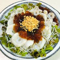 - 5 サニーレタスの上にタコを盛り、4を盛り付け、ちりめんじゃこ、ピーナツ、青ネギを散らして、完成です。