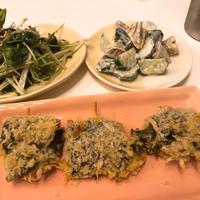 - 1 アジに塩こしょうをふり、大葉と梅肉をのせて巻き、巻き終わりを爪楊枝で留めます。
