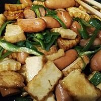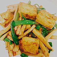 水切りした豆腐で作りました。豆腐は揚げ油でしっかり焼いて一旦取り出し、ごま油で筍とピーマンを炒めてから再投入してから調味料で炒めました。仕上げにウェイパーを小さじ1/3程度入れました。豆腐も壊れず美味しくできました。