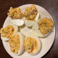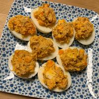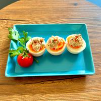 ちょっとしたひと工夫で、おしゃれにアレンジしたゆで卵のおつまみのご紹介です。ゆでた卵の黄身にツナマヨの材料を混ぜて、白身に盛りつけることで、ひとくちでいただけるオードブルになります。ベビーチーズの旨味もとてもよいアクセントになりますよ。お酒のおつまみや、ホームパーティーにおすすめです。