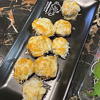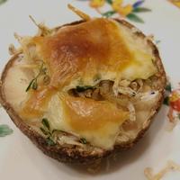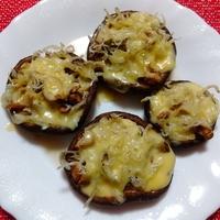 - 2 しいたけにちりめんじゃことチーズをのせます。アルミホイルを敷いた天板にのせオーブントースターで5分焼きます。