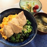 炒り卵(白だし、みりん)と、茹で小松菜(軽く塩)の上に、鶏むね肉を乗せました😄むね肉はフォークで全体を刺して、ビニール袋に砂糖と水を入れて揉み込んでしっとりさせてから耐熱容器に移して、醤油、鶏ガラ顆粒、にんにく、生姜(各チューブ)を入れて2回(表裏1回ずつ)レンチンしました。美味しかったです😄